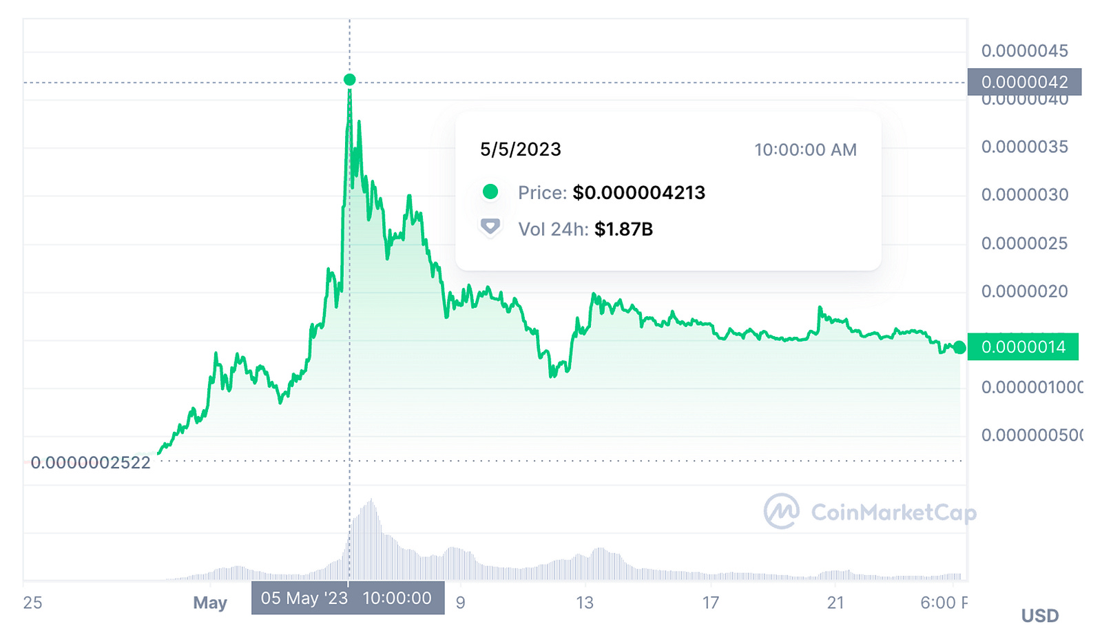 [12] Data from CoinMarketCap, as of May 25: https://coinmarketcap.com/currencies/pepe/